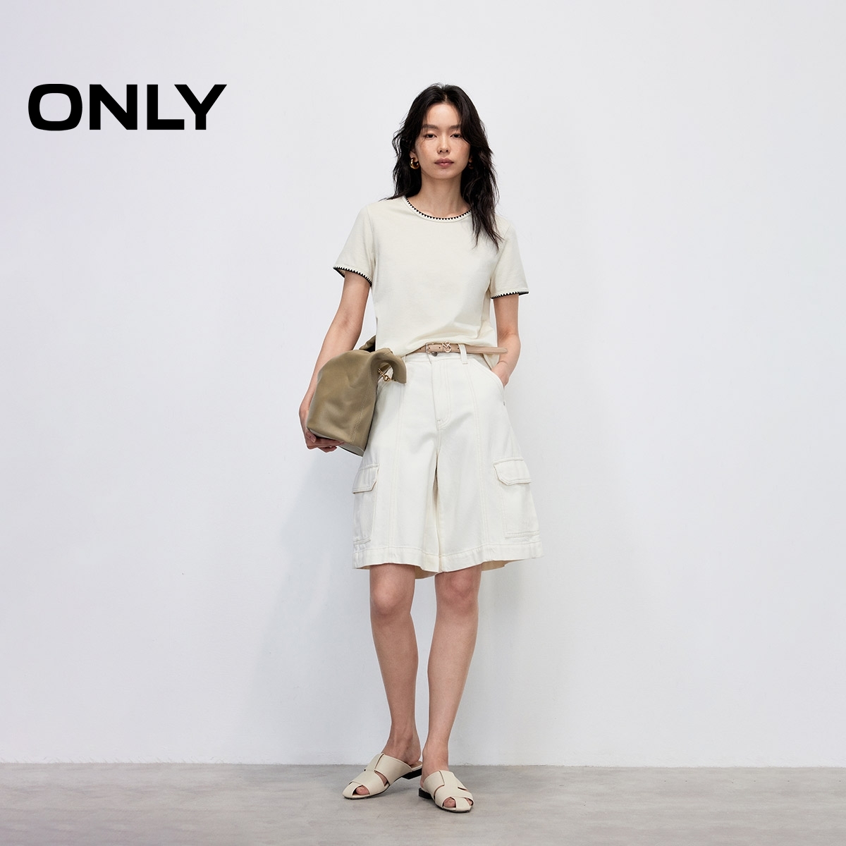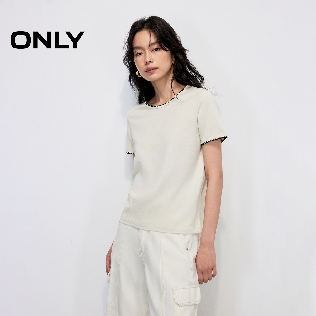 ONLY2025夏季 简约淡人莱赛尔亚麻开叉圆领刺绣显瘦正肩T恤女 新款