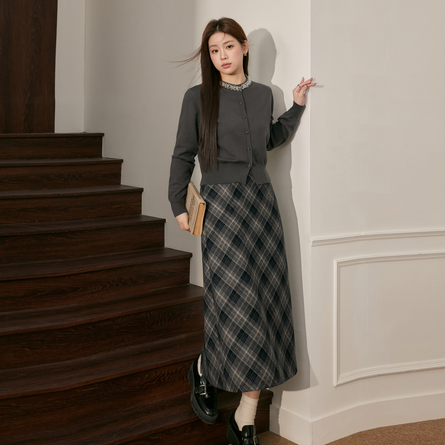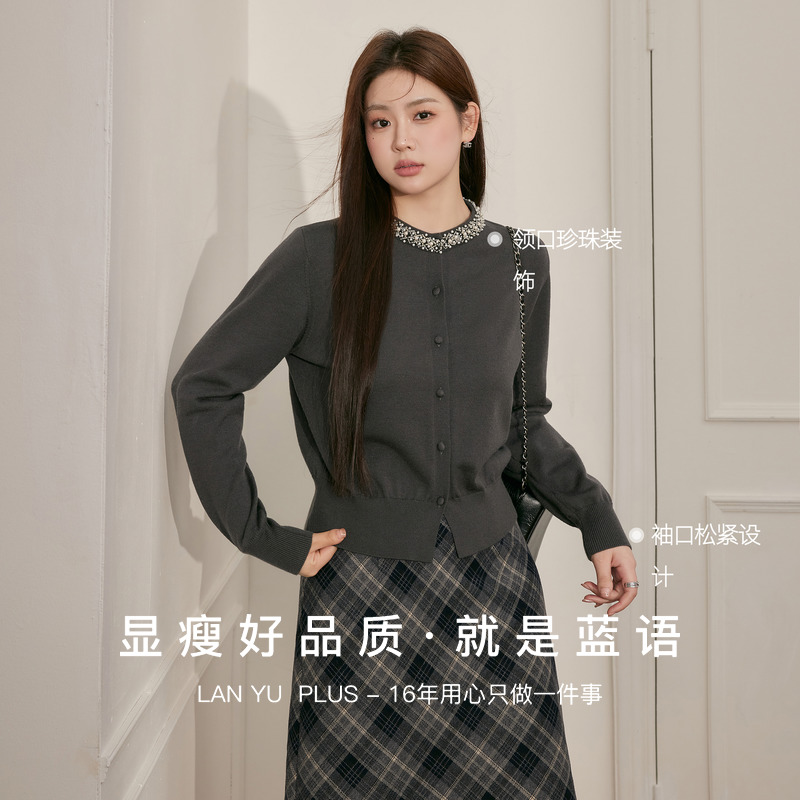 上衣显瘦格纹半身裙秋季 胖mm小香风针织衫 一整套穿搭 女装 蓝语大码