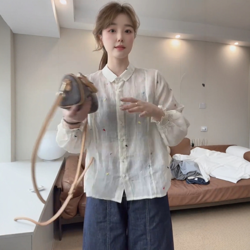 女2025秋设计感宽松减龄叠穿衬衣小衫 韩系刺绣娃娃领白色长袖 衬衫