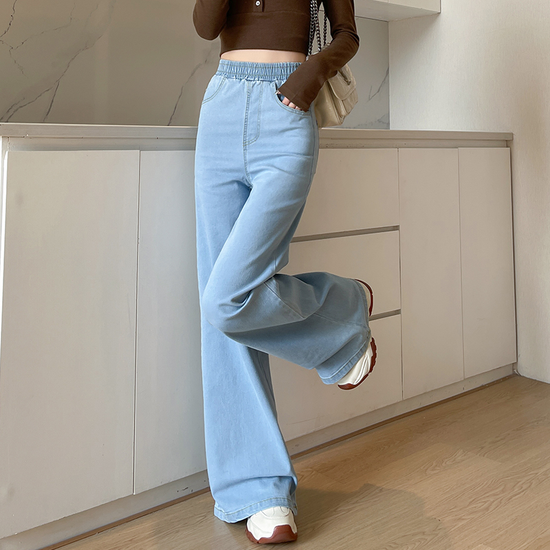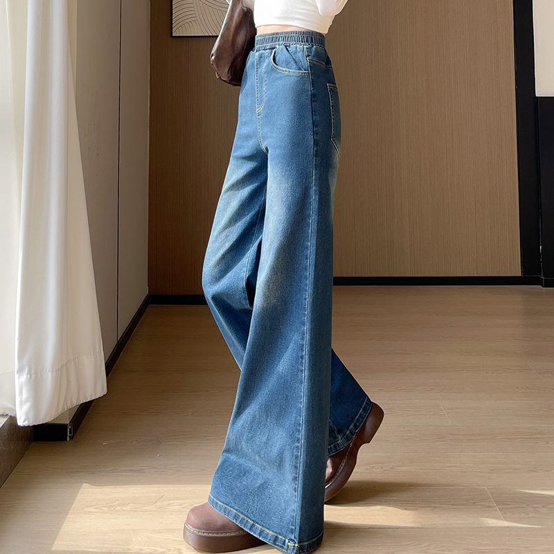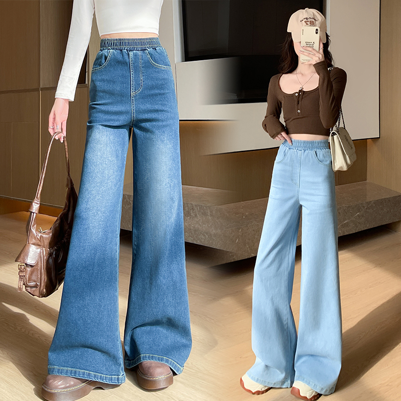 胖妹妹遮胯显瘦百搭阔腿拖地裤 大码 春夏季 松紧腰牛仔微喇叭裤 女装