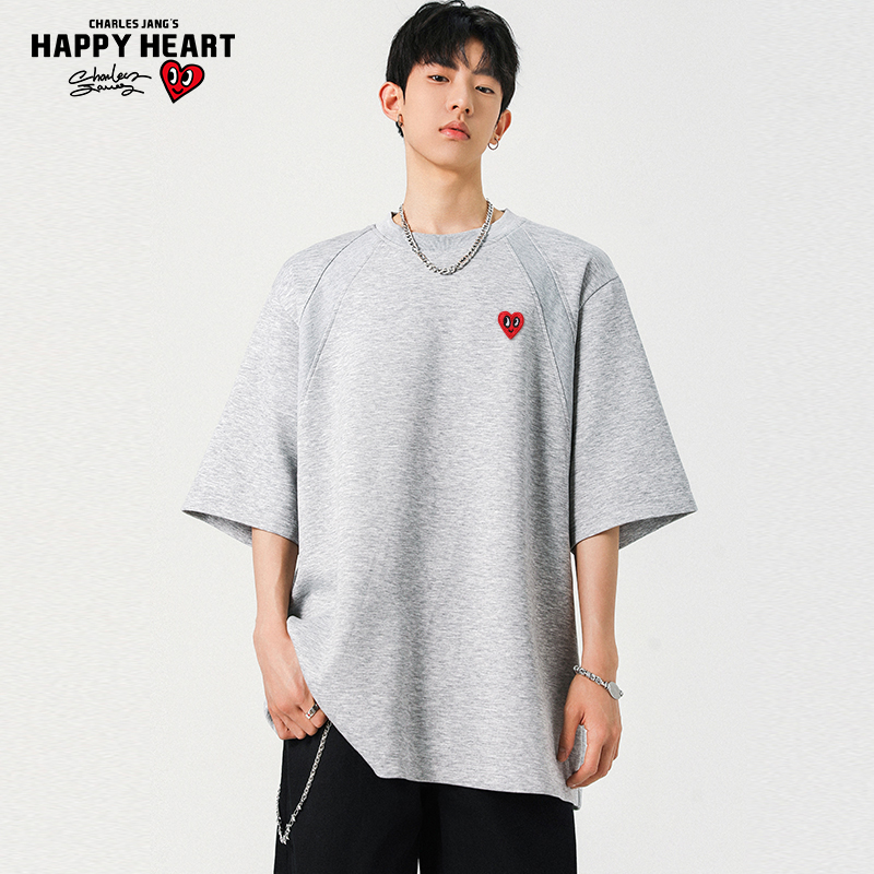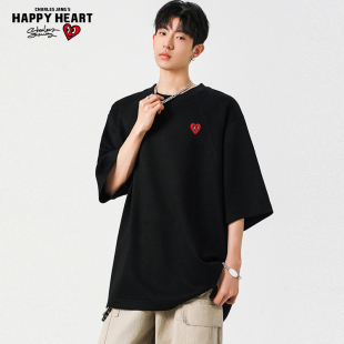 痞帅高街宽松大码 查尔斯桃心 T恤男夏季 解构分割拼接圆领短袖 美式