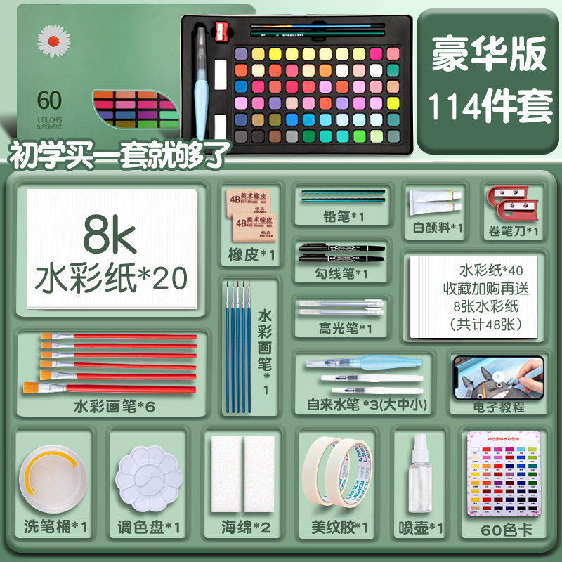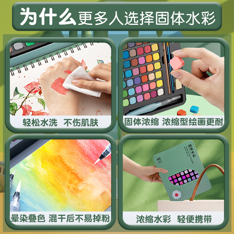 水彩纸水粉颜料本画画工具美术生固体颜料小盒初中生专用 铁盒装 固体水彩画套装 全套初学者水彩颜料专用便携式