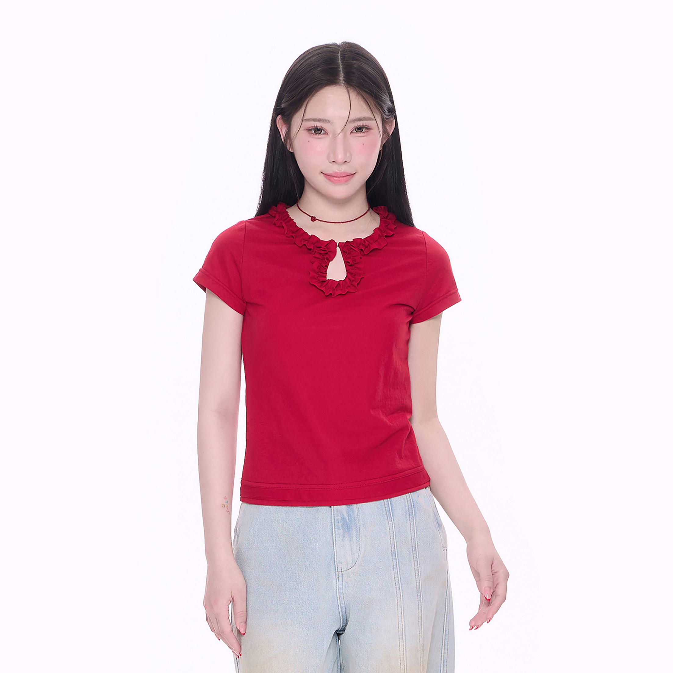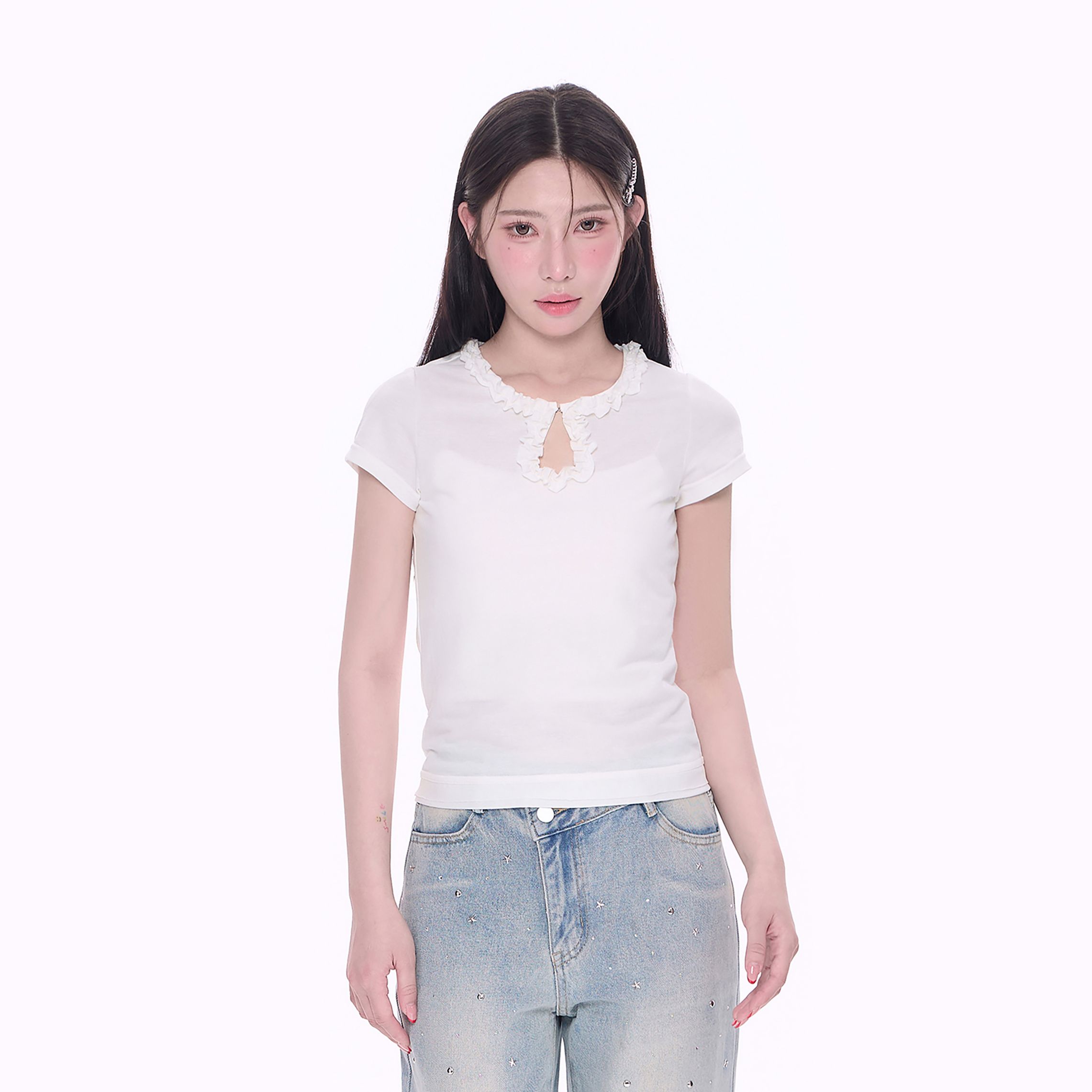 T恤短款 短袖 正肩少女感DX25063 立体花边水滴钩扣领口修身 NCXK