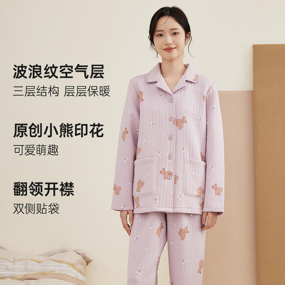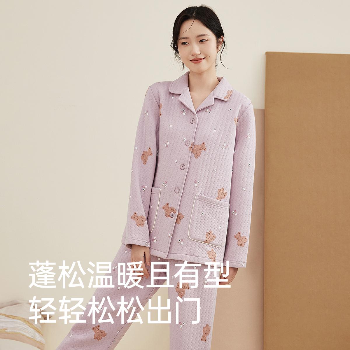 冬天 三层加厚夹棉小熊印花可外穿家居服套装 顶瓜瓜睡衣冬季 女款