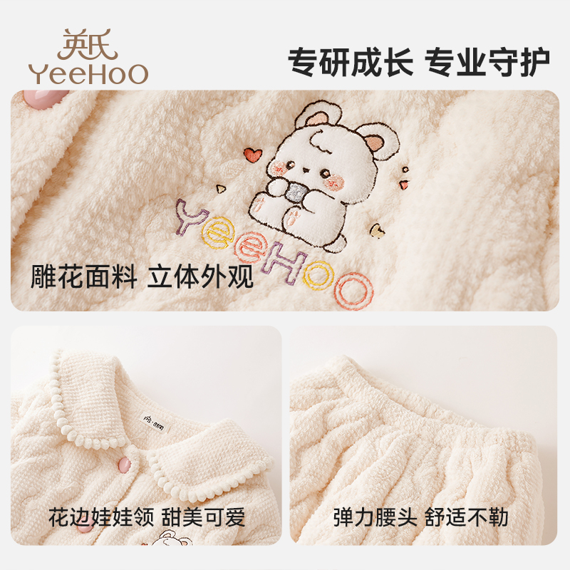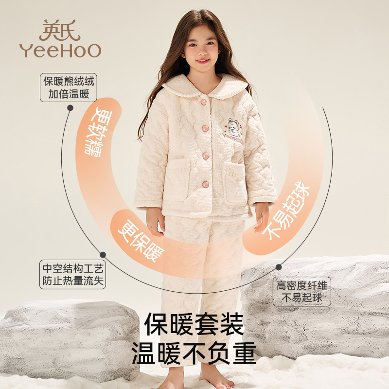 英氏女童睡衣秋冬三层加厚法兰绒2025新款 A类 儿童翻领家居服套装