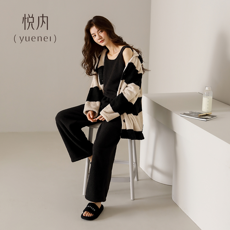 大码 春秋开衫 女士家居服 加厚珊瑚绒睡衣女冬法兰绒加绒套装 秋冬季