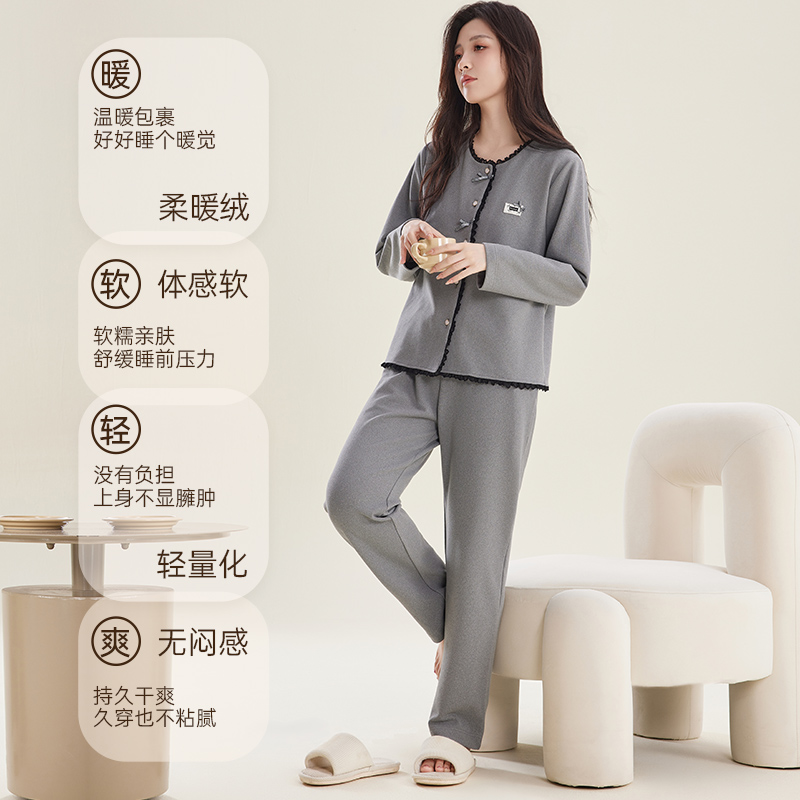 冬季 2025新款 长袖 长裤 猫人纯棉睡衣女款 简约休闲家居服套装 春秋季