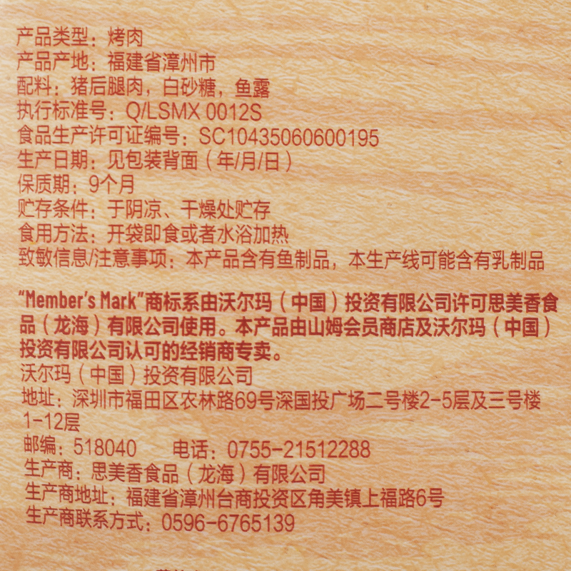 山姆代购 猪肉脯500g果木熏烤潮汕蜜汁风味碳烤猪肉干休闲零食超市