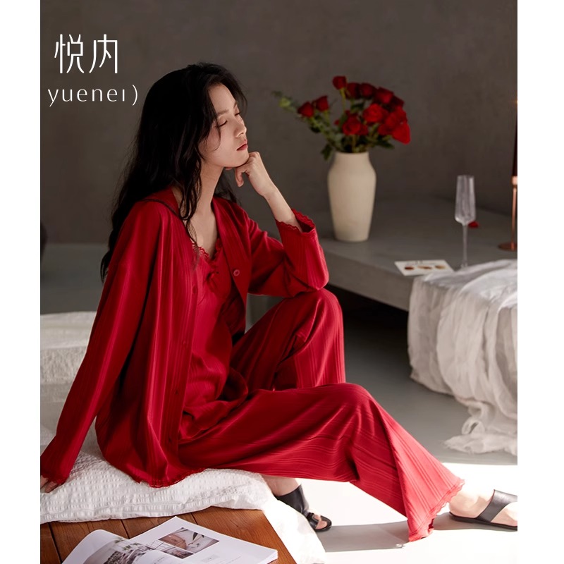 男春秋 带胸垫家居服套装 A类抗菌防螨纯棉情侣睡衣女长袖 红豆夏季