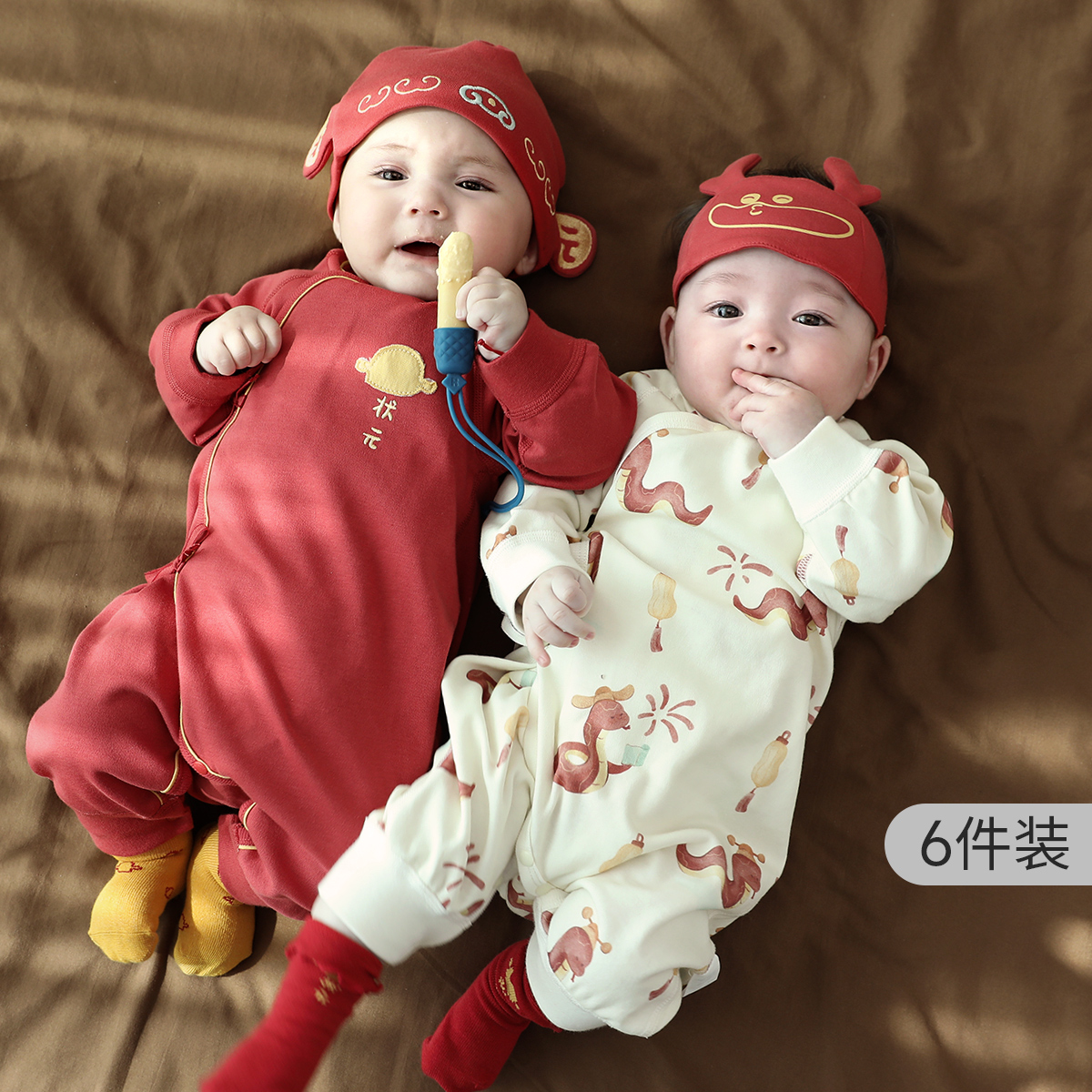 满月百天龙蛇宝宝衣服国风红色新年服新生儿连体衣婴儿春秋6件装