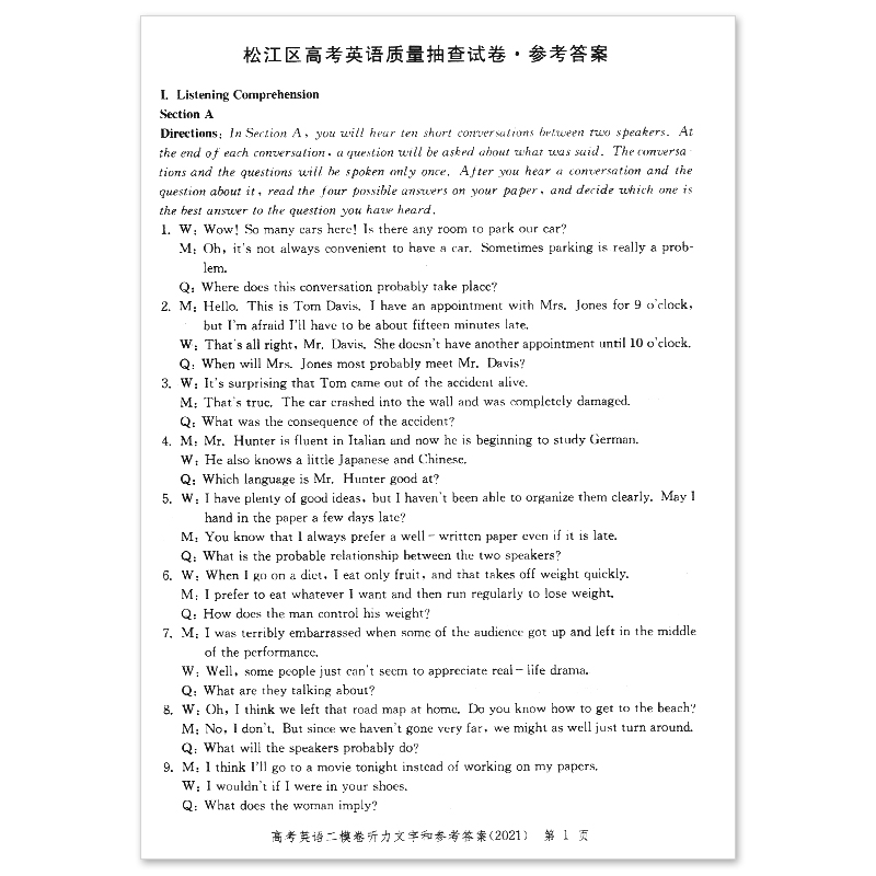 仅参考答案 高考英语 二模卷 上海高考二模卷 中西书局 2021年版 上海市各区县高考考前质量抽查试卷精编 走向成功