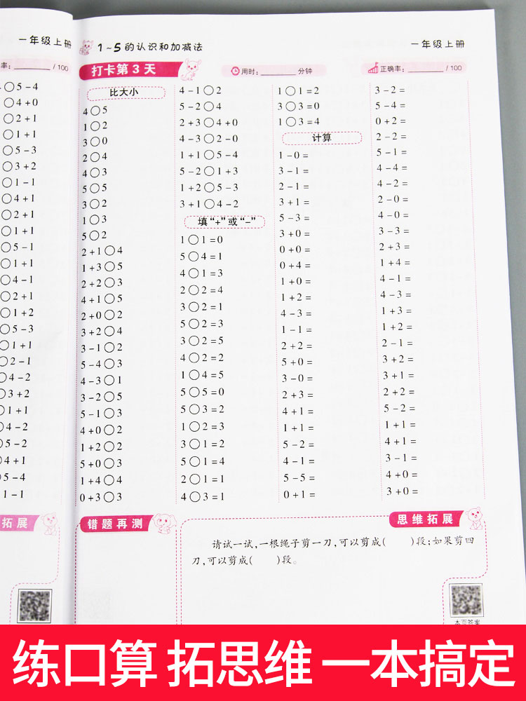 2021年一年级口算题卡上册每天100道天天练人一年级上册口算题卡 10以内加法和减法20以为进退位数学 每天100道题教材同步练习