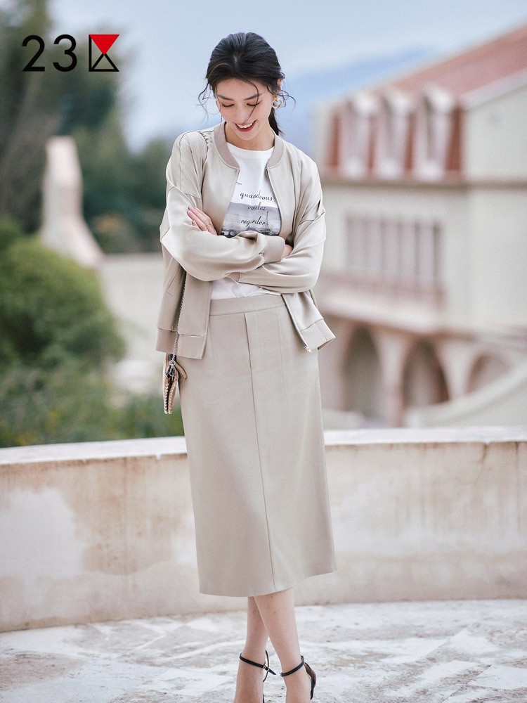 衣香丽影咖色直筒高纤皮裙女2025秋冬装 显高显瘦开衩半身裙子 新款