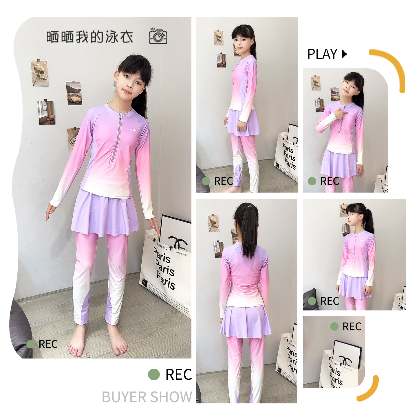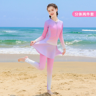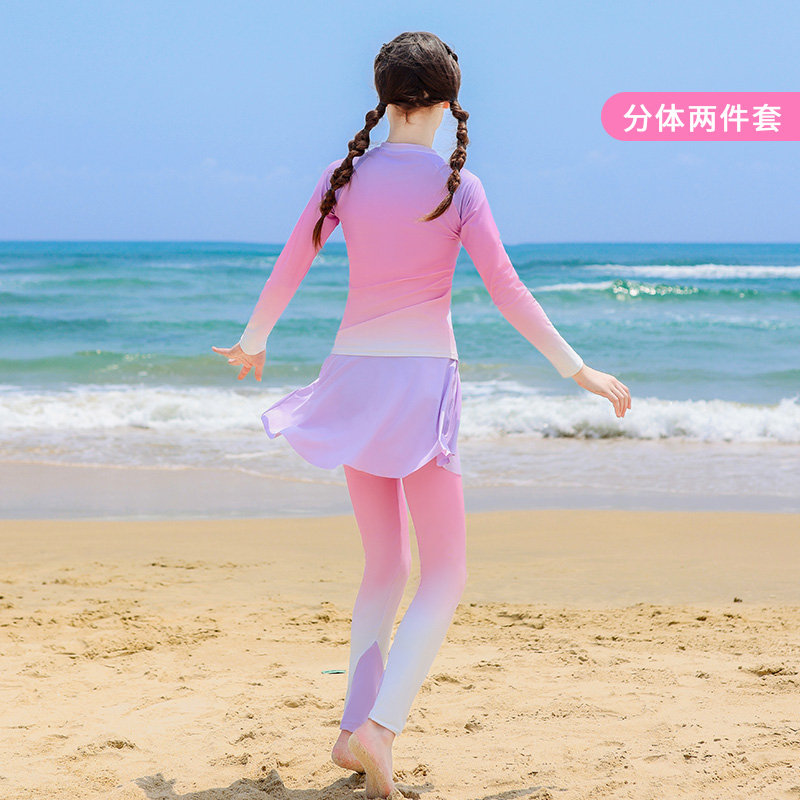 特步儿童游泳衣2025年新款 分体中大童学生游泳训练冲浪服 女童长袖