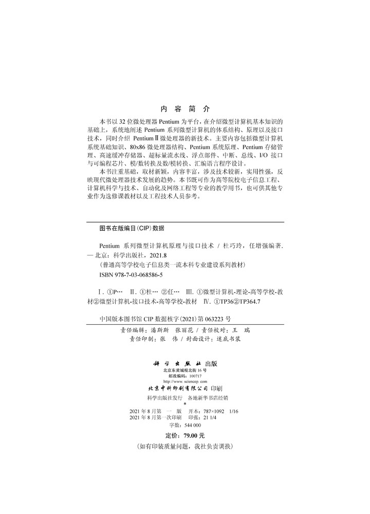微型计算机原理与接口技术 Pentium系列 杜巧玲 任增强 社书籍kx 科学出版 京联