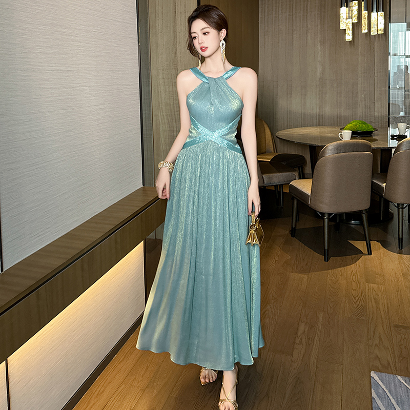 XZY 微胖mm贵气古早风钉珠挂脖连衣裙女名媛气质重工长裙 欣争艳