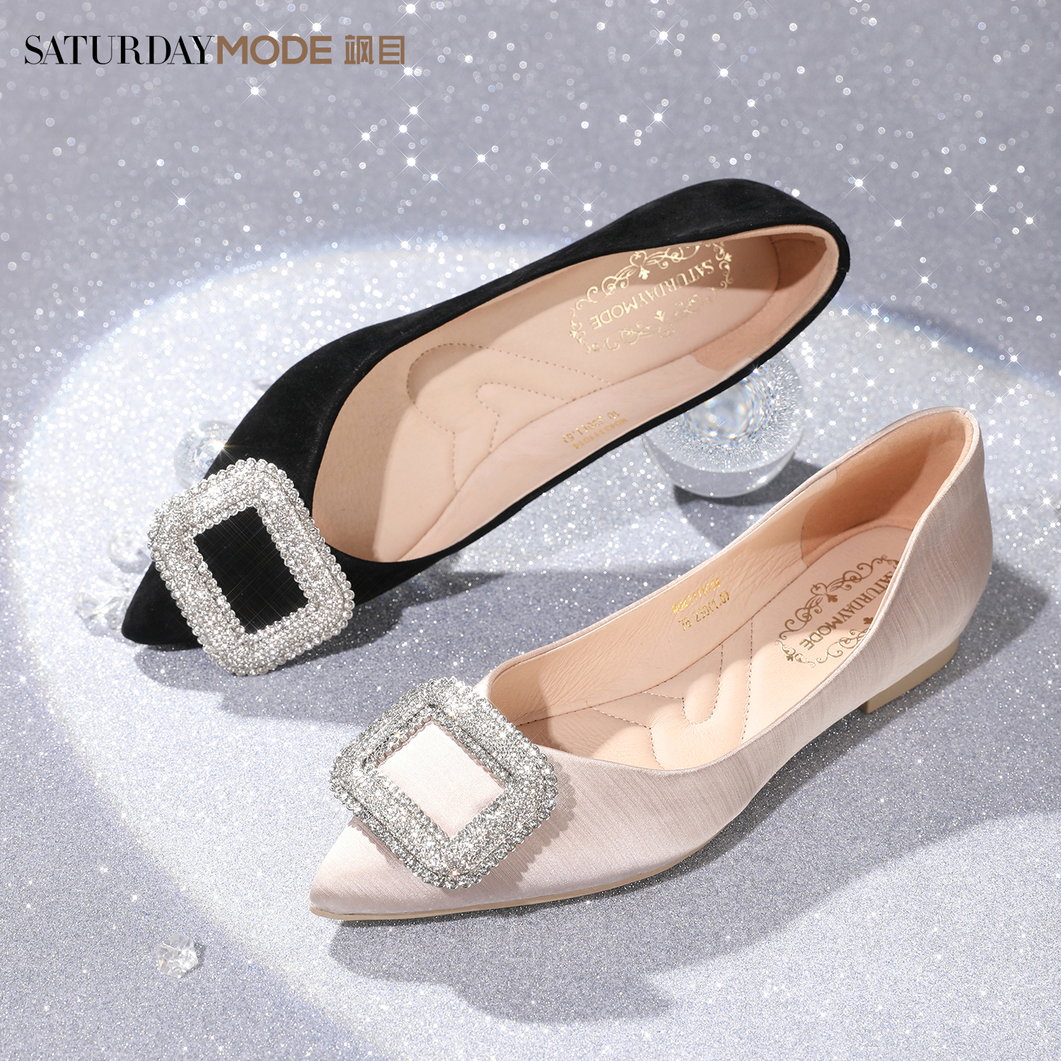 超软羊皮平底鞋 晚晚风黑色气质单鞋 春季 方扣水钻瓢鞋 子 新款 MD女鞋