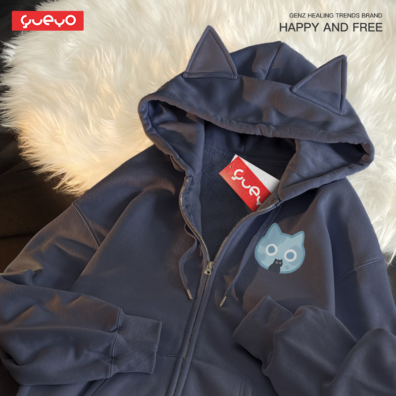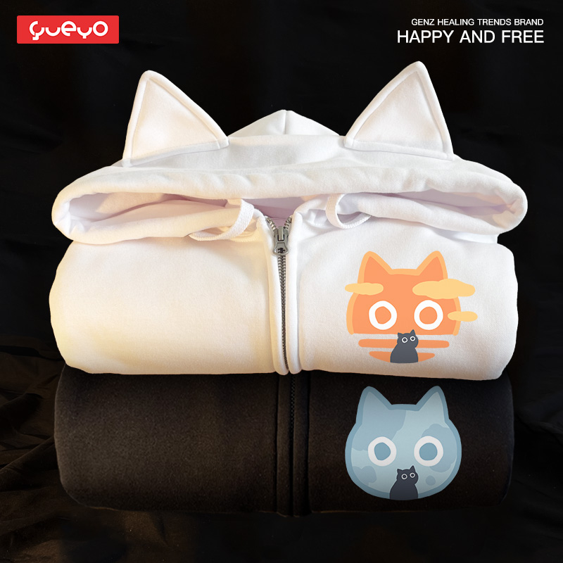 悦游「猫耳外套」有耳朵 可爱卫衣男moon黑猫加绒连帽日系ins