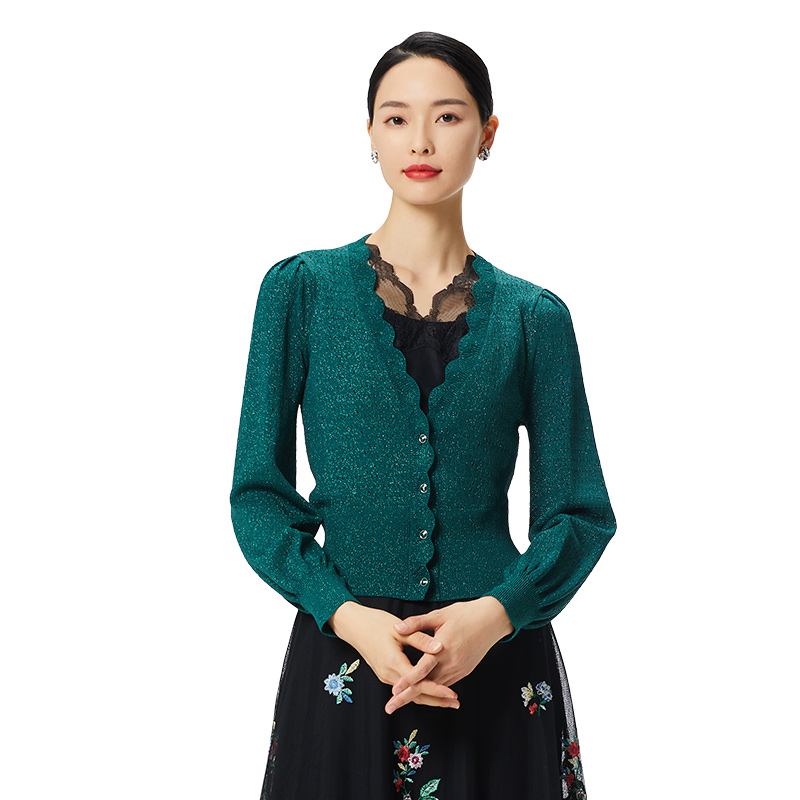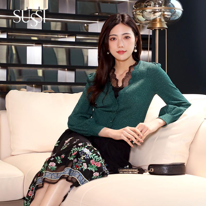 外套毛衣女 绿色花边V领针织开衫 SUSSI 古色23春商场同款