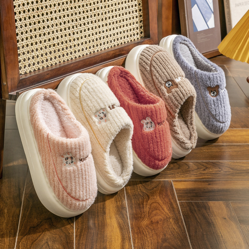 情侣 无跟厚底防滑踩屎感居家室内加绒毛绒拖鞋 保暖棉拖鞋 女冬季