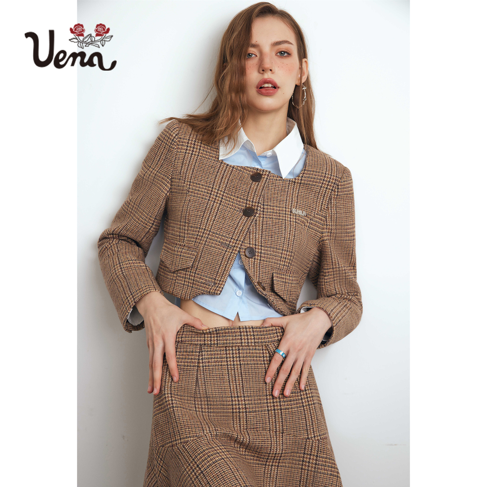 羊毛呢外套可拆卸羽绒内胆 Uena学院风千鸟格棕色短款 馥芮山茶