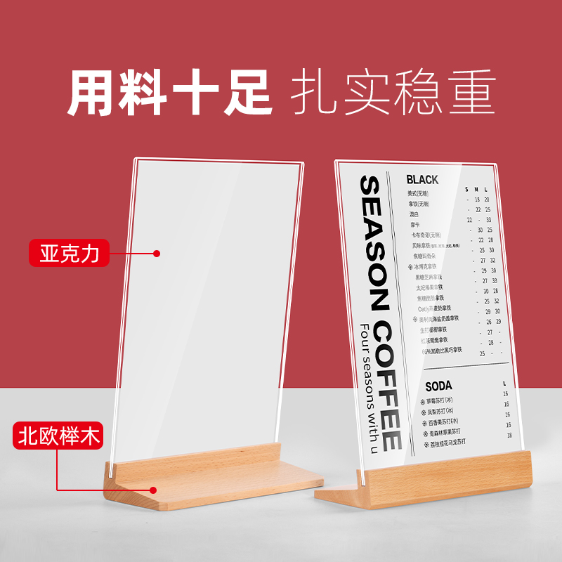 亚克力台卡立牌木质底座台卡实木桌牌a4展示牌菜单台牌榉木台签价格牌桌面会员充值广告牌餐桌点餐价目表a5纸