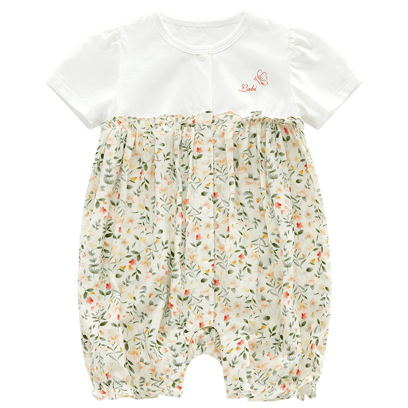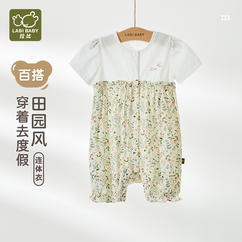拉比婴儿花边全开连体衣圆领田园风春夏新款 哈衣爬服 女宝宝短袖
