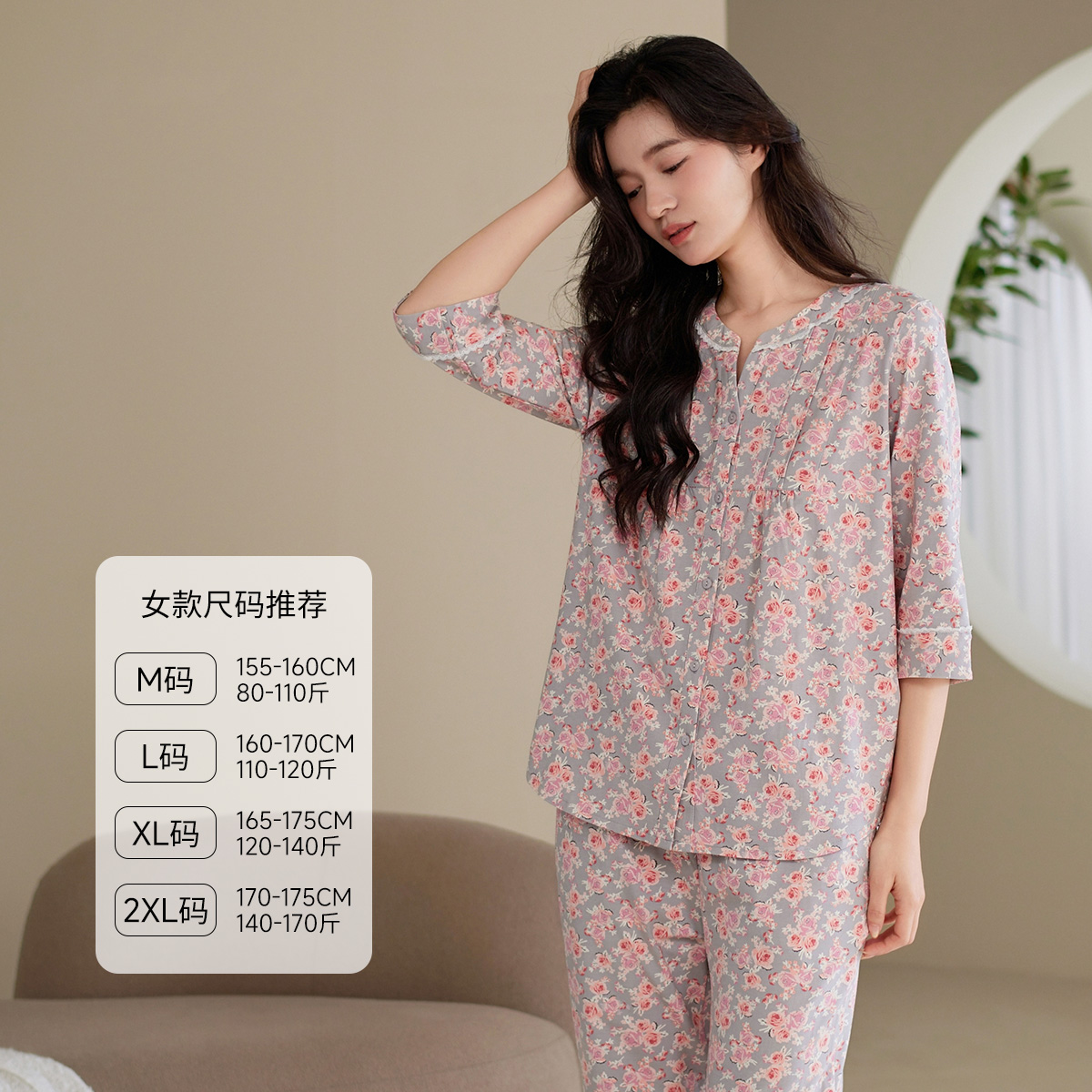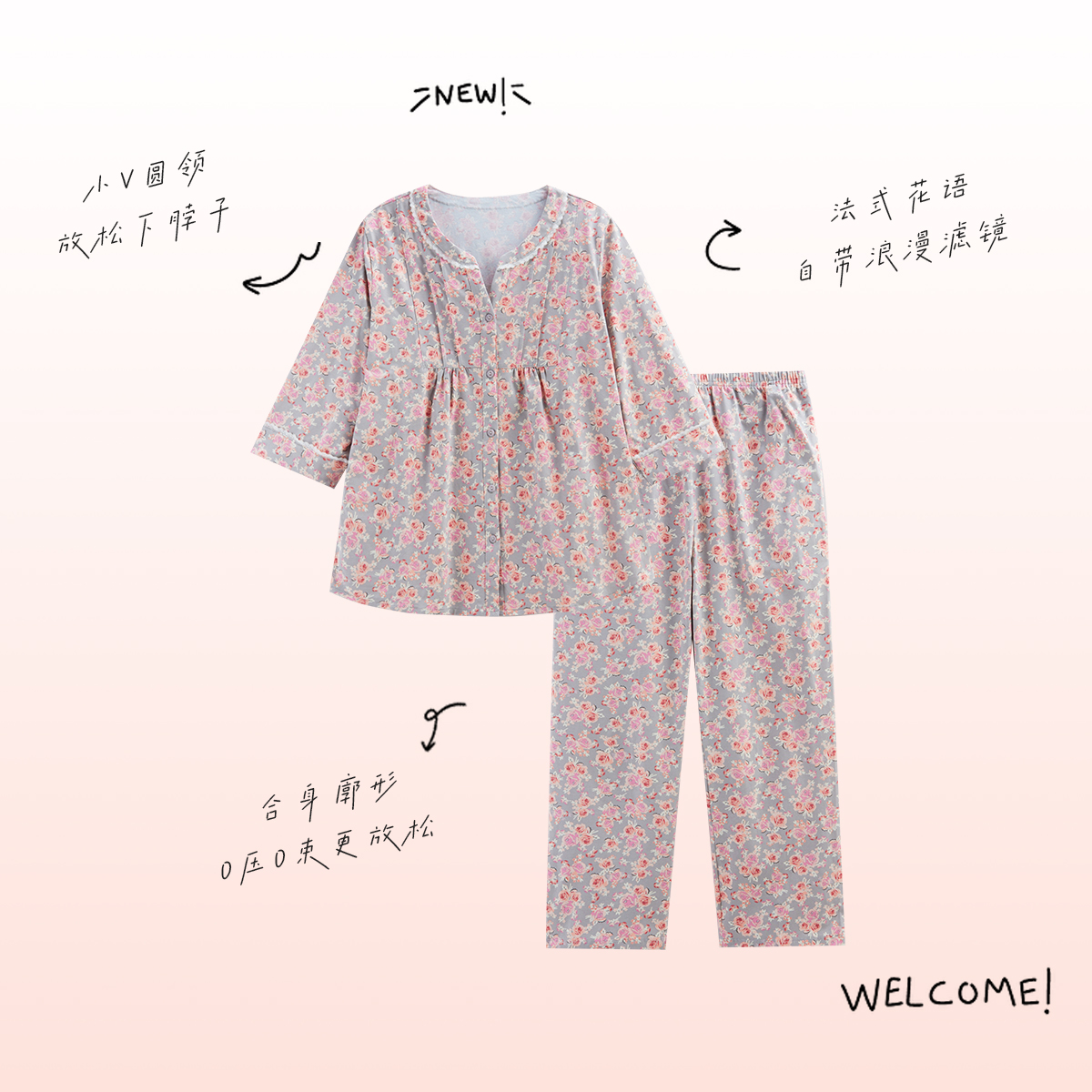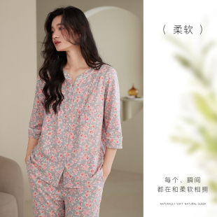 家居服套装 秋鹿柔软纯棉睡衣女士春秋V领法式 碎花蕾丝花边七分袖