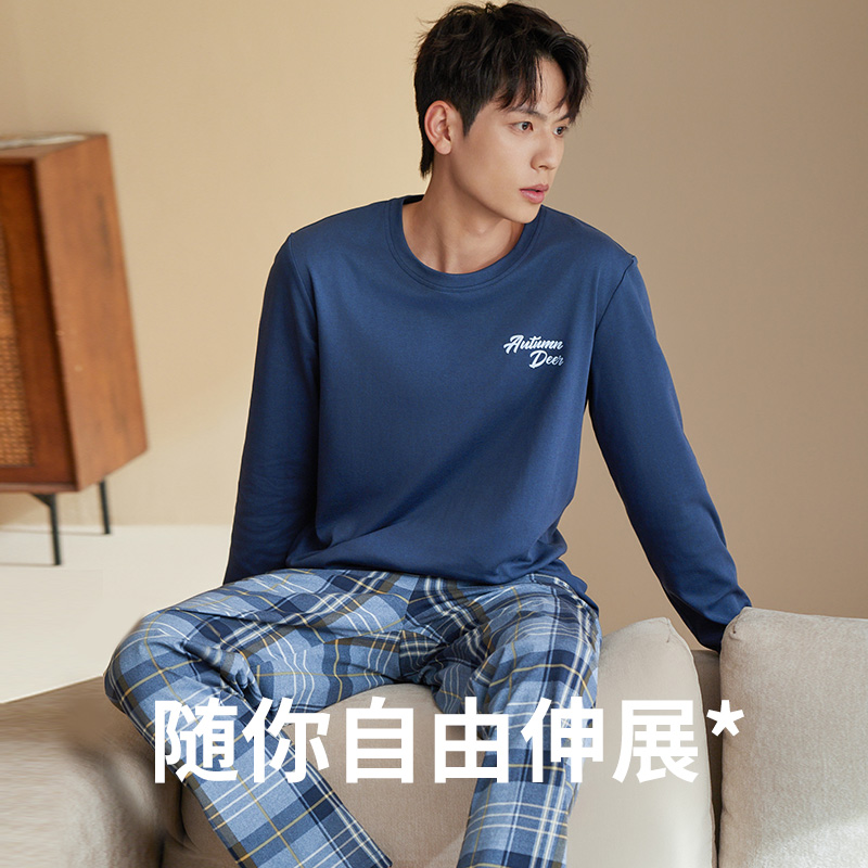 长袖 秋鹿先生 睡衣春秋款 纯棉男士 格子可外穿家居服 尾货清仓
