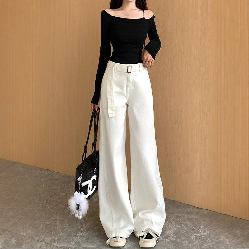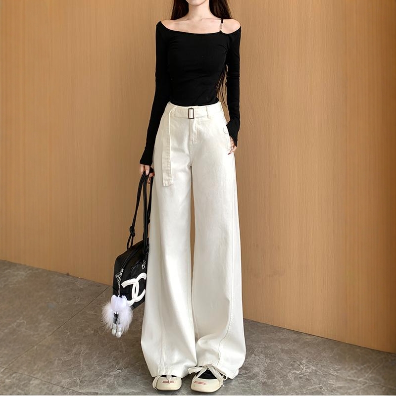 MOVEUP幻走2024春秋松紧腰撞色宽松显瘦绣花直筒裤 女 子弯刀牛仔裤