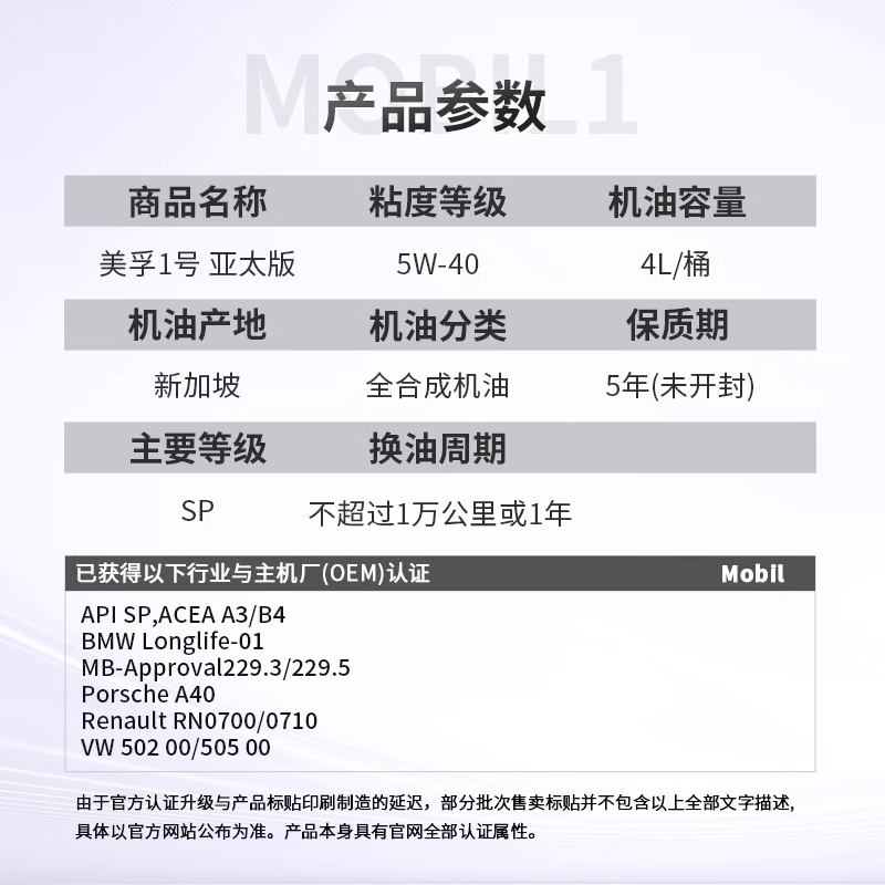 B4发动机汽机油 40新加坡A3 表现5W 美孚一号全合成机油经典