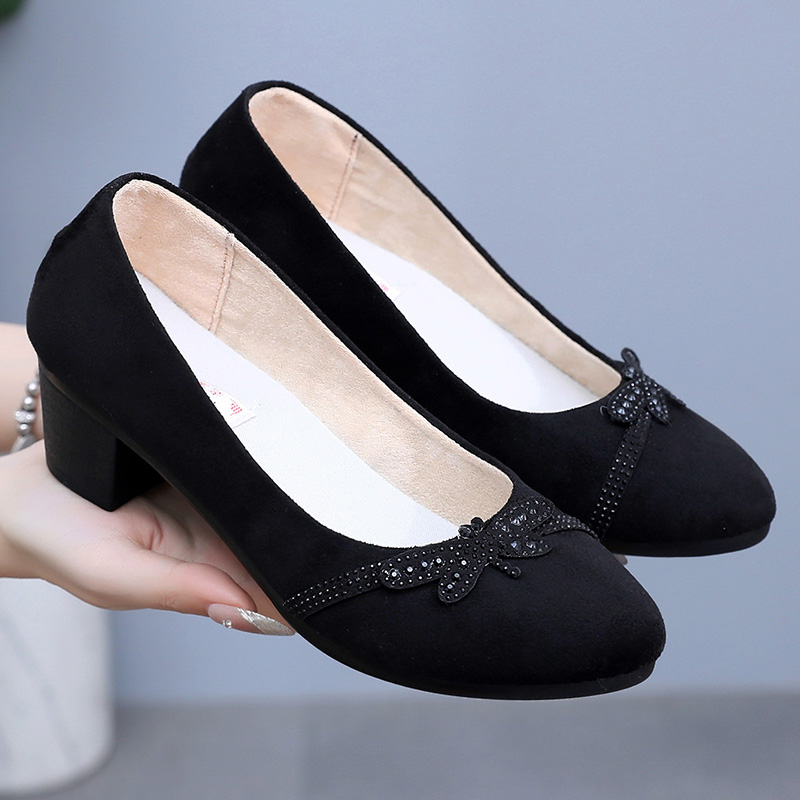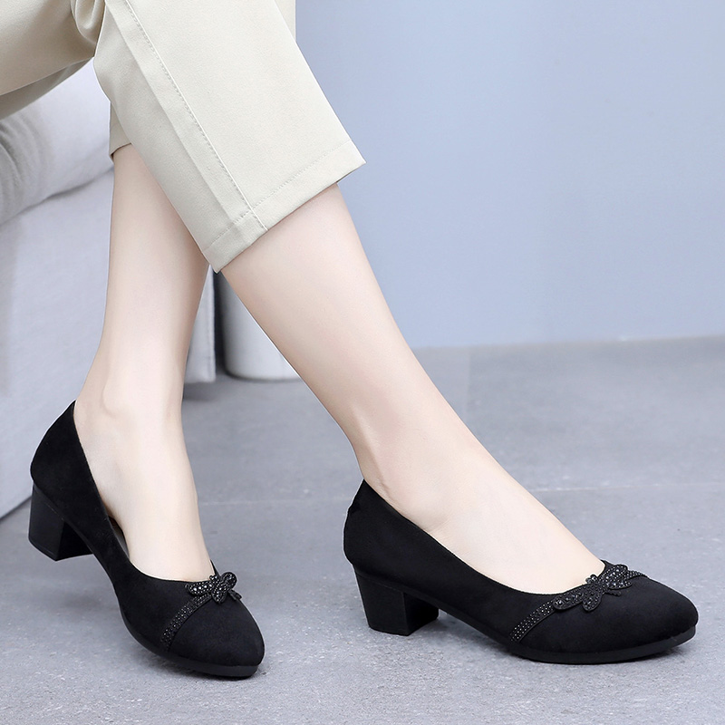 女秋季 工作鞋 2025新款 粗跟妈妈鞋 软底不累脚 浅口高跟鞋 老北京布鞋