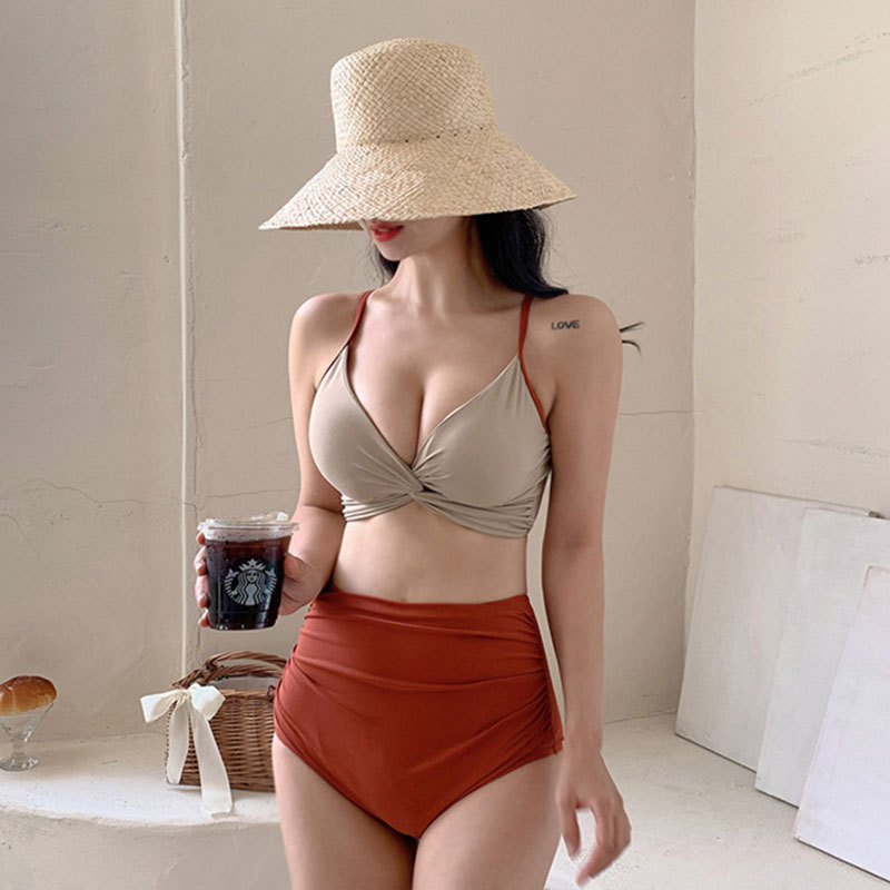 女泳衣ins风2024年女比基尼分体聚拢性感BIKINI撞色高腰遮肚泳装