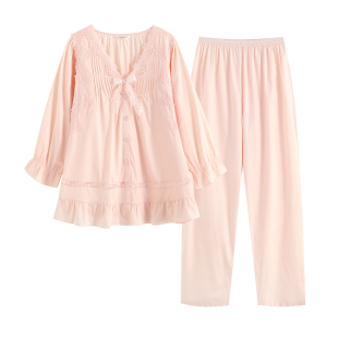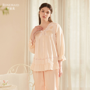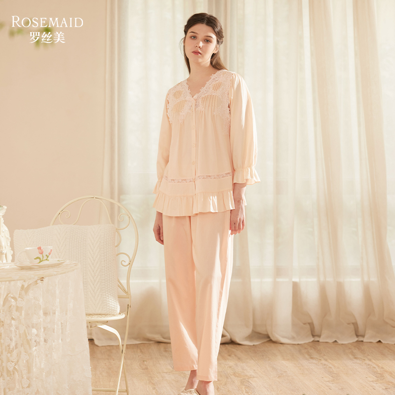 13044 套装 罗丝美60支直贡小蕾丝家居服100%棉长袖 睡衣女宽松衣裤
