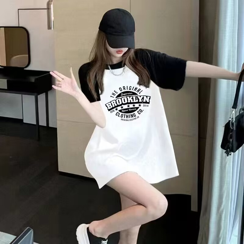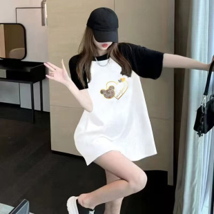 宽松卡通纯棉上衣减龄半袖 遮臀大码 夏 遮屁股中长款 拼色t恤女短袖