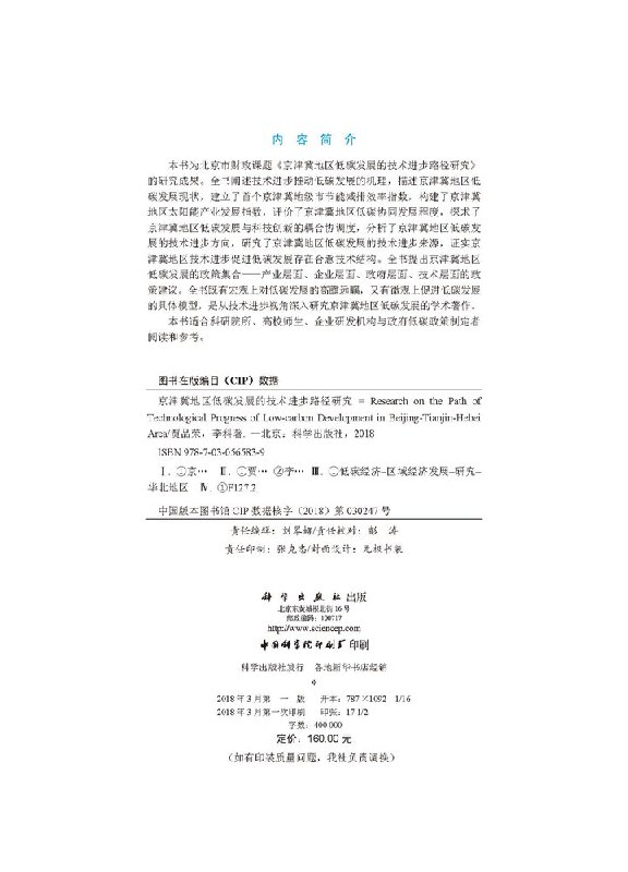京津冀地区低碳发展 社 技术进步路径研究科学出版