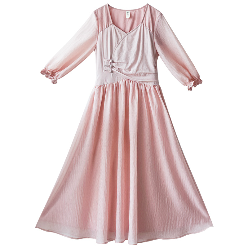 断码 盘扣旗袍领连衣裙收腰长袖 秒杀 新中式 缎面气质 太平鸟女装