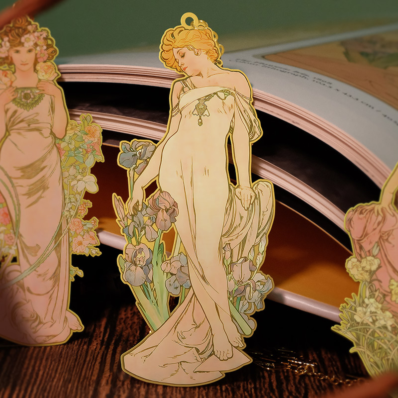 先锋插画师新艺术运动唯美大师名画复古优雅文艺礼品黄铜中商文创 插画艺术金属链饰书签20世纪时尚 MUCHA穆夏 四朵花—鸢尾