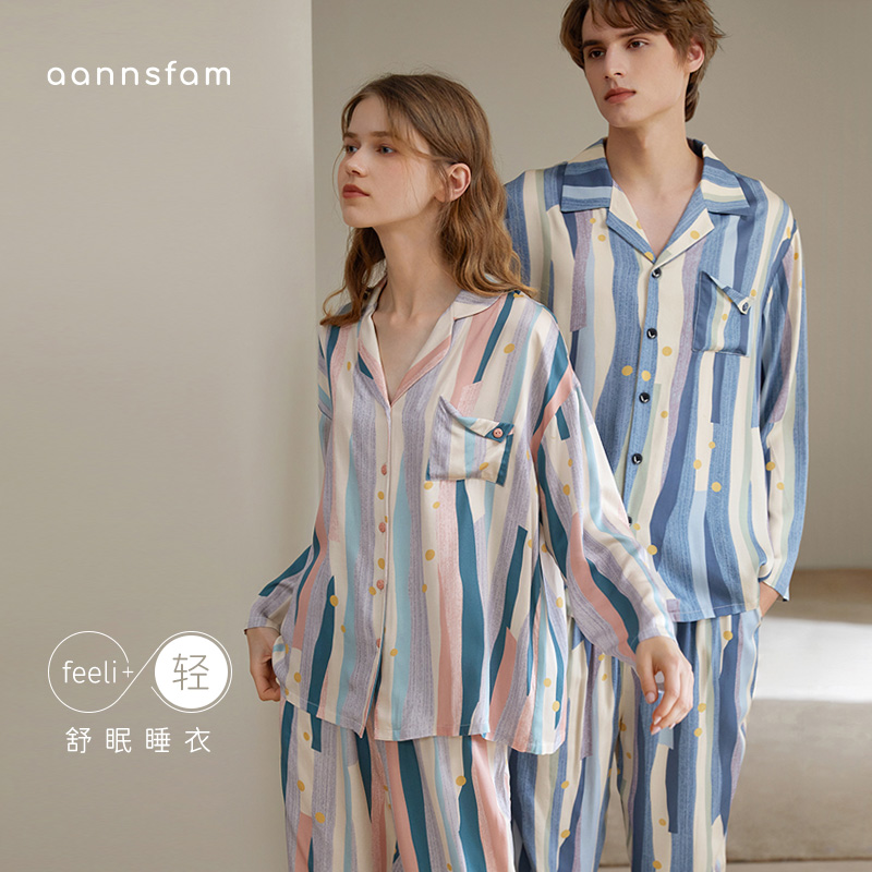 新款 套装 长袖 开衫 情侣睡衣女柔软莫代尔棉家居服男大码 贝妍春秋季