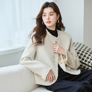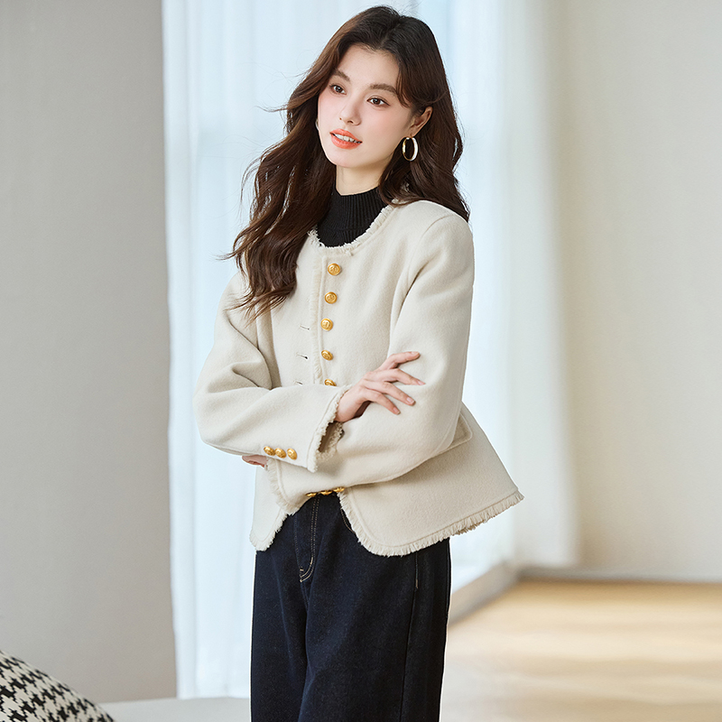 3S女装 小香风文艺气质圆领显瘦毛边造型双面呢外套女 冬季