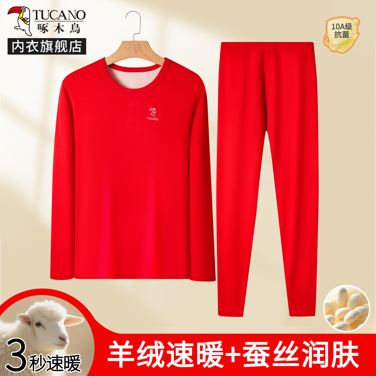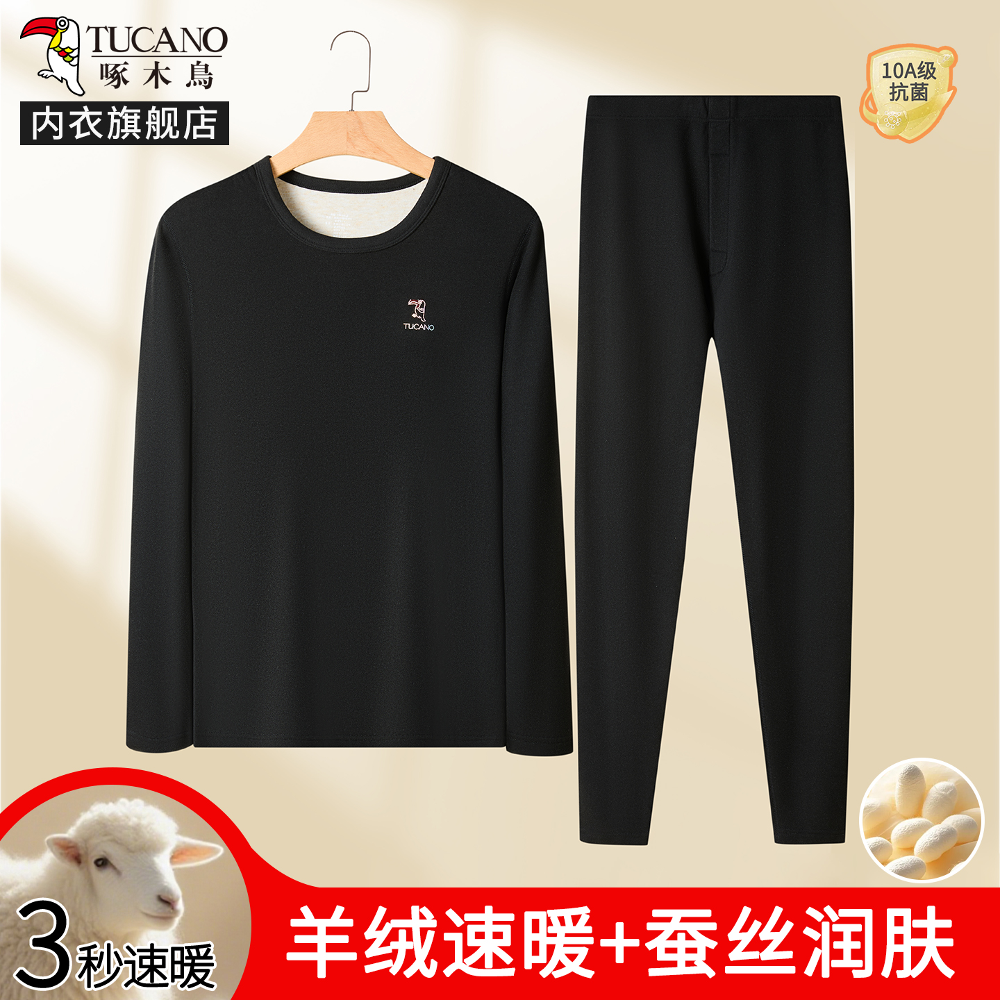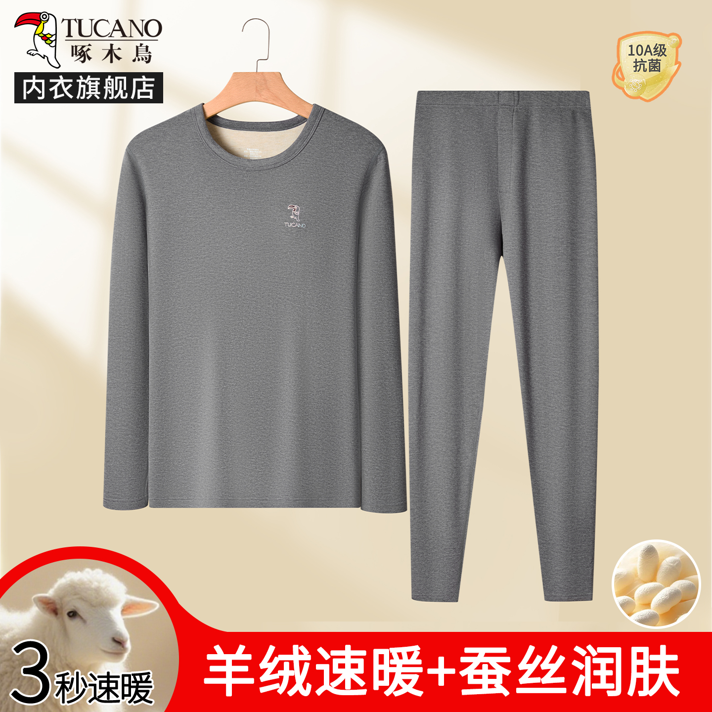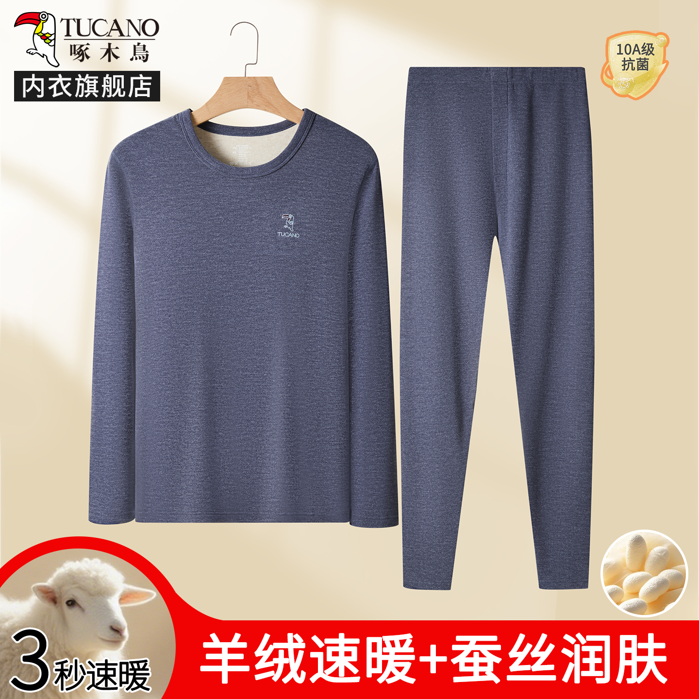 加绒加厚羊绒蚕丝打底中老年秋衣秋裤 啄木鸟德绒保暖内衣男士 套装