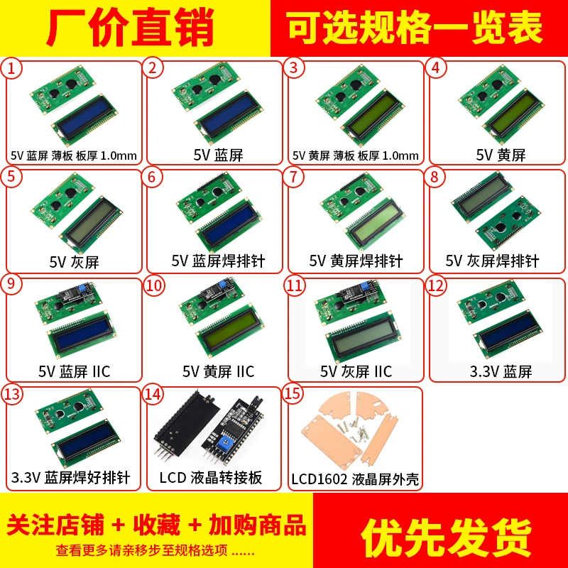 LCD1602A液晶显示屏5V蓝屏黄屏3.3V黄绿屏灰屏 I2C模块 焊排针IIC
