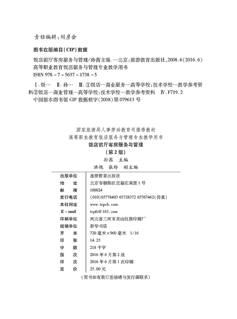 社 孙茜主编9787563717385旅游教育出版 饭店前厅客房服务与管理 第二版