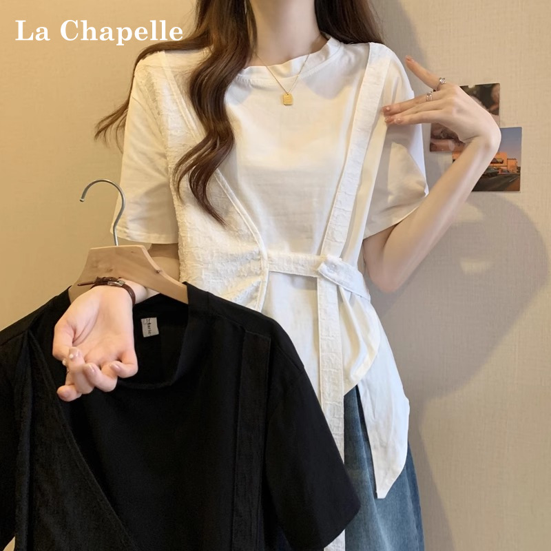 胖mm显瘦不规则开叉上衣 大码 拉夏贝尔白色假两件短袖 T恤女夏季