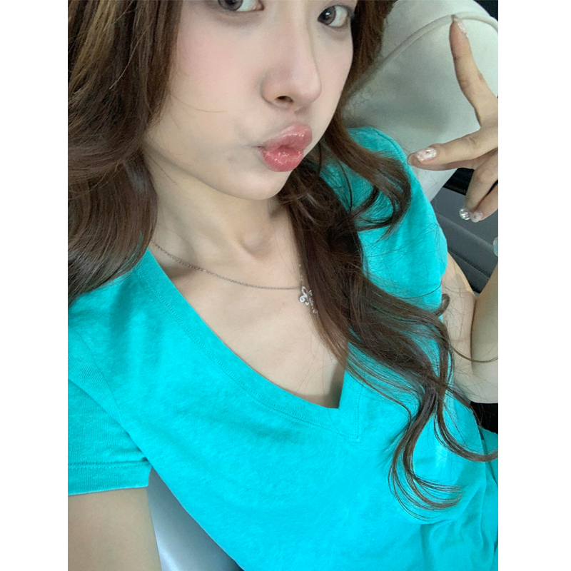 上衣简约百搭休闲体恤 潮宽松显瘦半袖 正肩V领纯色短袖 T恤女夏韩版