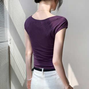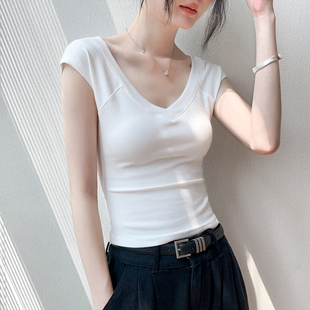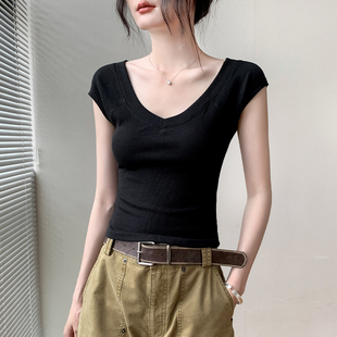 内搭上衣 显瘦露锁骨性感纯色时尚 歌倍尚深V领短袖 t恤女夏2025修身