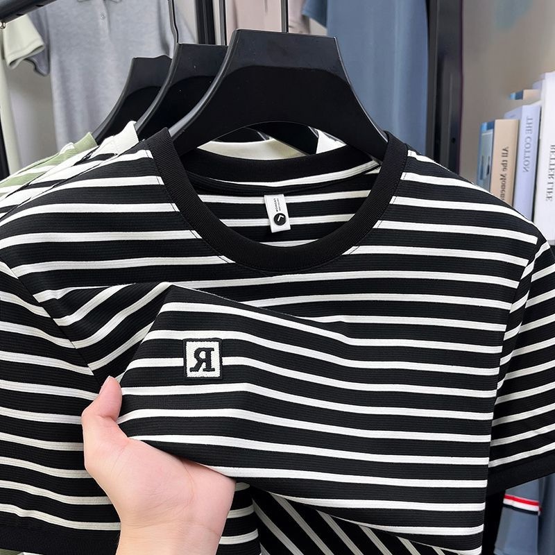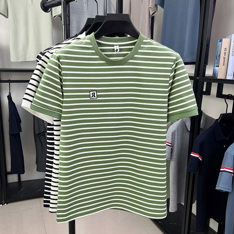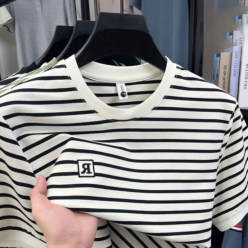 宽松百搭圆领半袖 2025夏季 时尚 t恤男士 体恤 休闲条纹拼色刺绣短袖
