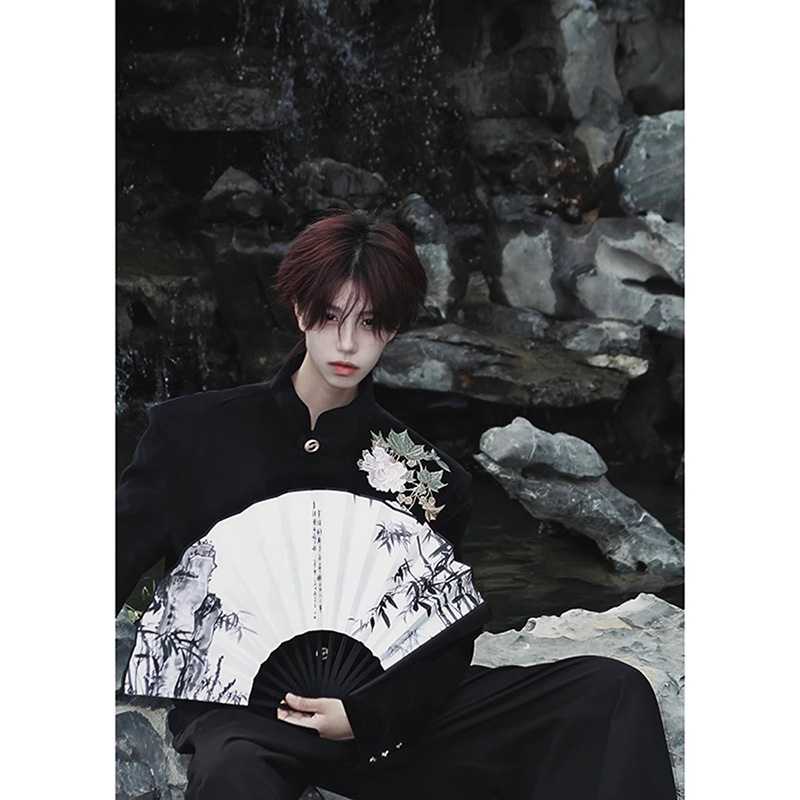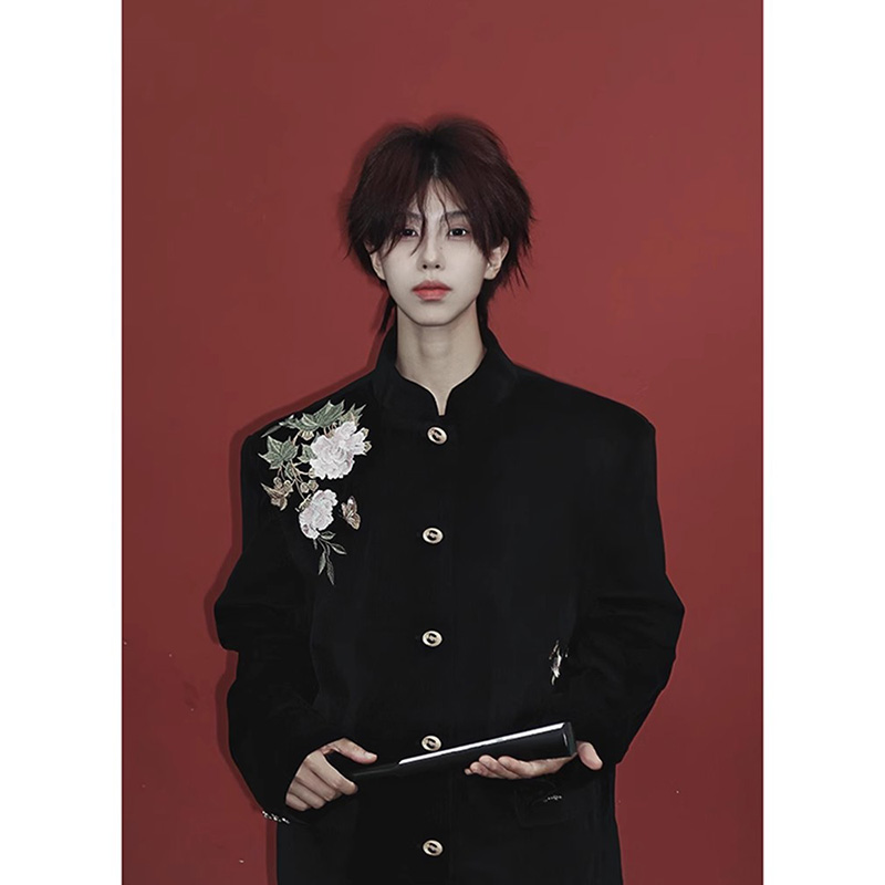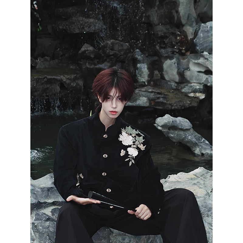 男套装 正装 订婚穿搭礼服高定戗驳领垫肩西服 山茶花刺绣西装 新中式