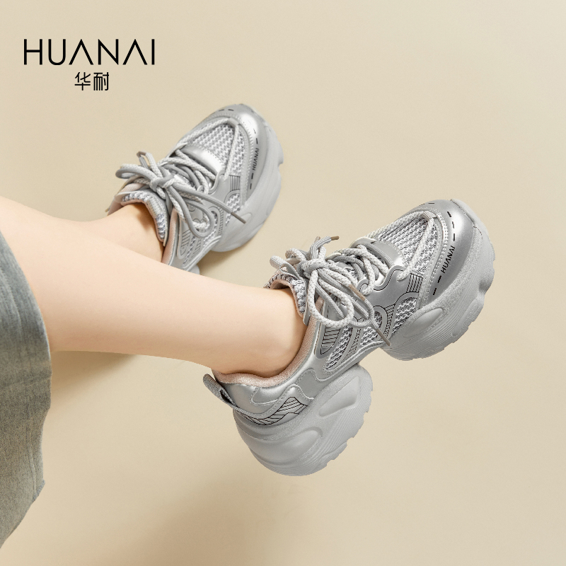 小个子休闲鞋 增高网面透气轻便运动鞋 2025新款 华耐银色厚底老爹鞋