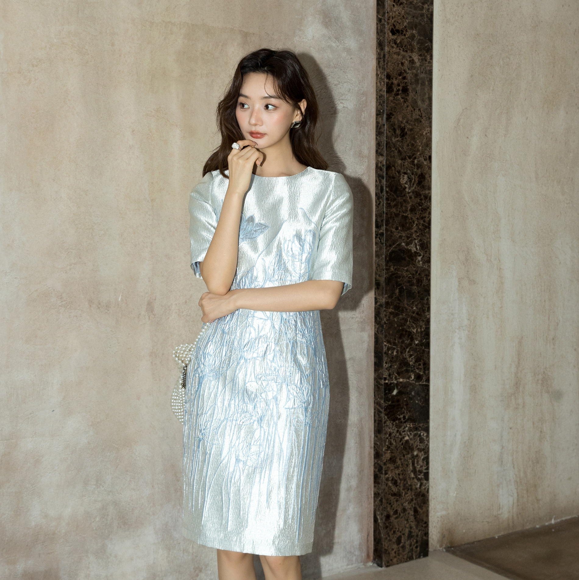 圆领小香风蓝色设计提花连衣裙新款 收腰气质温柔千金名媛裙子2961